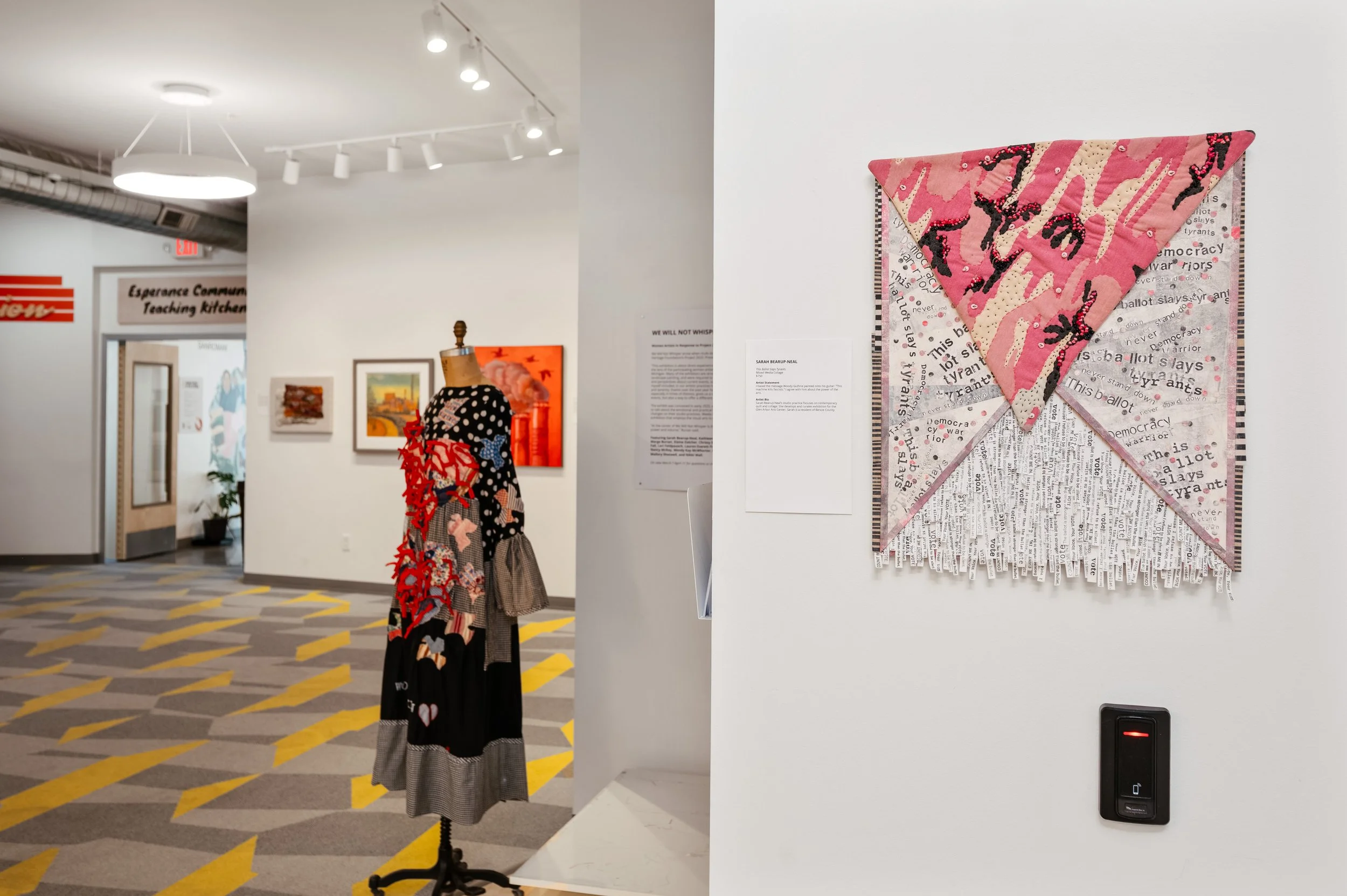 We Will Not Whisper showcases the work of 21 women artists responding to the implications of Project 2025 through painting, fiber, video, and mixed media.
