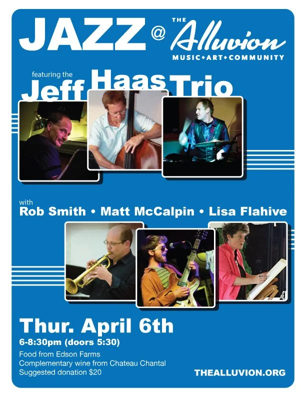 Thursday evenings are a special night of music and gathering at The Alluvion. You never know what form of Jazz that Jeff Haas will play, or what inspiring, talented guest musicians he’ll invite to the stage! The foundation of this wonderful band is Randy Marsh on Drums, Jack Dryden on Upright Bass, and Jeff Haas on Acoustic Grand Piano. On April 6th, The Trio invites Rob Smith on Sax & Trumpet, Matt McCalpin on Guitar, and artist Lisa Flahive to join in as special guests!